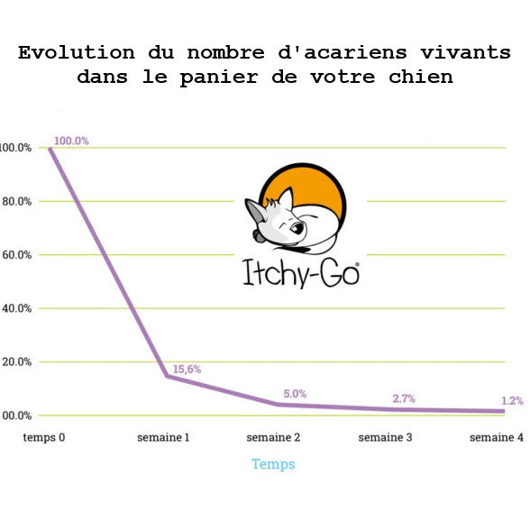 ITCHY-GO® utilise une formule écologique spécialement conçue, non pas pour éliminer directement les acariens, mais pour les attirer vers le tissus sur lequel est vaporisé le produit. Ainsi, la population d’acariens diminue sensiblement dans le lieu de couchage de votre animal.